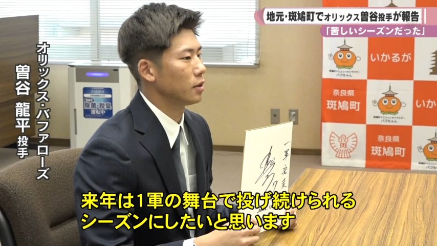 - 斑鳩町出身の曽谷投手は、去年ドラフト1位で入団。プロ1年目の今シーズン、1軍で10試合に登板し、リーグ最終戦でプロ初勝利を挙げて1勝2敗、防御率3.86の成績を残しました。中西町長らを前に、曽谷投手は今シーズンを振り返り、「プロの選手と対戦する厳しさを感じ、苦しいシーズンだった。」などと述べました。そして、来シーズンの抱負として「一軍完走」と書いた色紙を掲げ、次のように述べました。