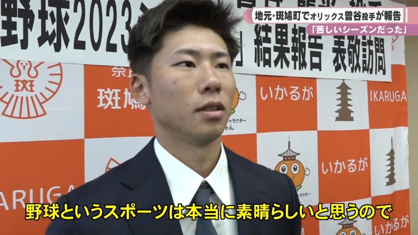 - プロ野球オリックス・バファローズの曽谷龍平投手が1日、斑鳩町役場を訪れ、今シーズンを振り返りました。