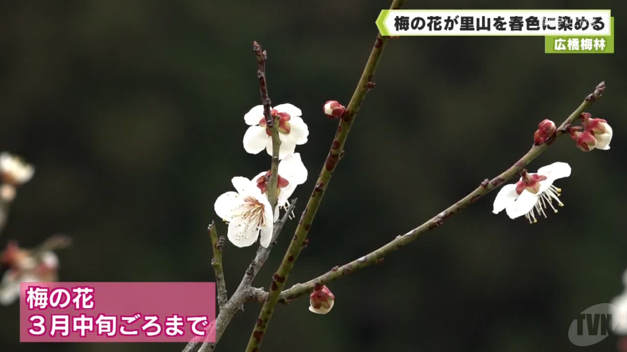 - 県の三大梅林の一つ下市町にある広橋梅林では、見ごろを迎えた梅の花が里山を春の色に染めています。