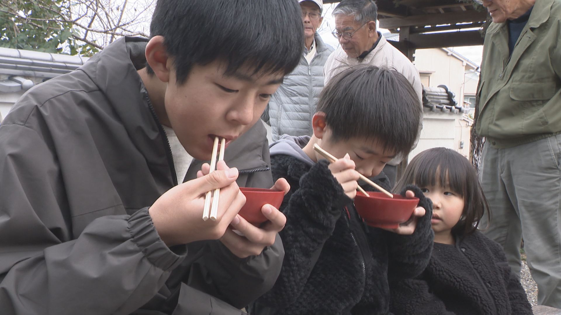 また、蓮の実が入ったぜんざいが子どもには、無料で振舞われ新年を穏やかに迎えられるように祈る鐘の音を聞きながら味わっていました。