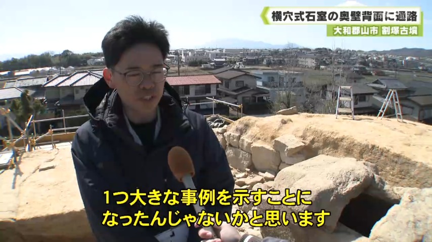 市によりますと奥壁背面に通路が確認された例は、国内で2例目だといい、1例目の高取町の市尾墓山古墳では棺の蓋を運び入れるための通路と考えられています。しかし、割塚古墳では蓋の幅よりもせまく埋葬時の儀式などに使われたと推測されるということです。