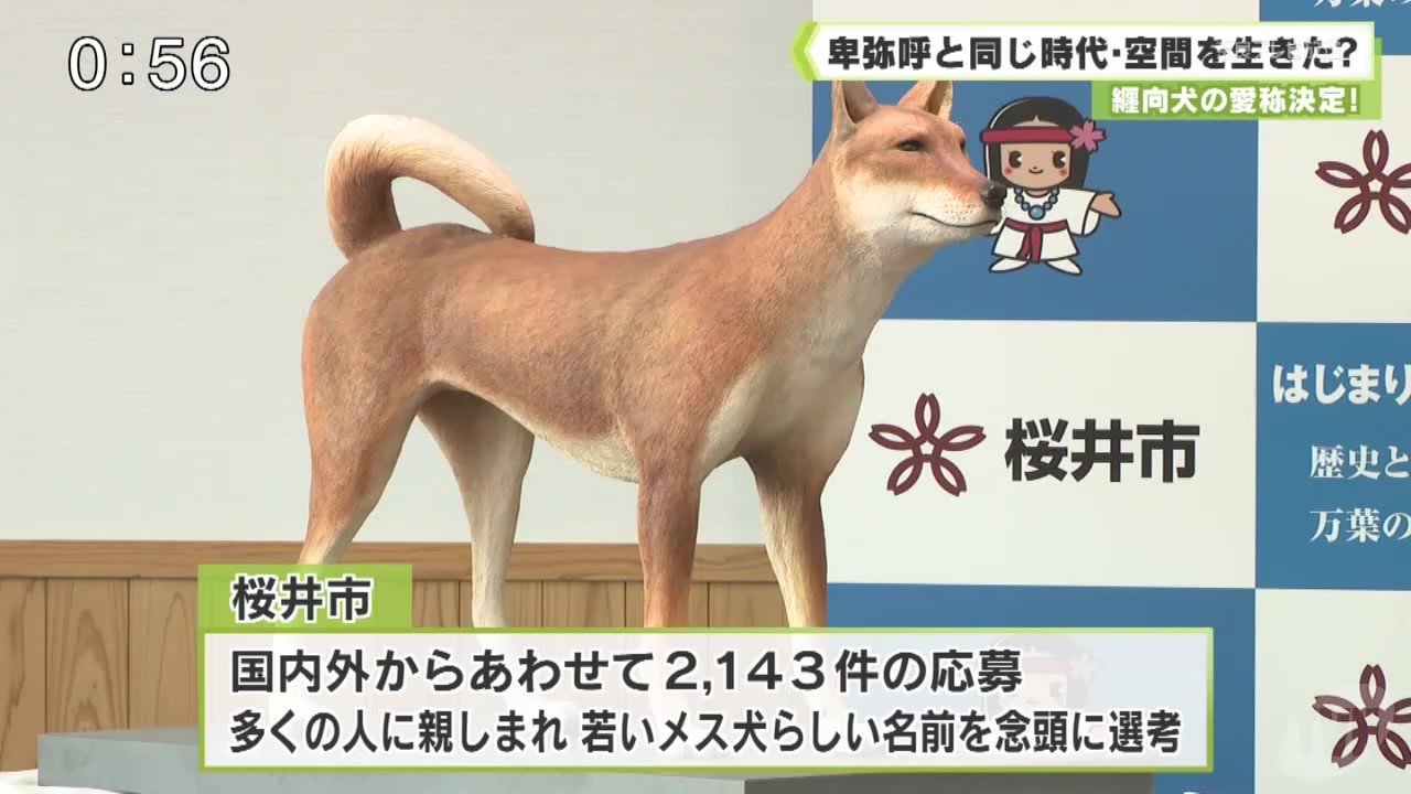 - 纒向遺跡では、邪馬台国の女王・卑弥呼の宮殿ともみられている大型建物跡の東側で、2015年、発掘調査の最中に館を囲んでいた溝から犬の骨が140点あまりみつかりました。骨の分析から、1歳半以上の若いメスと推定され、桜井市教育委員会と纒向学研究センターが復元調査を行ってきました。そして、2025年の春に出来上がった復元模型の愛称を、広く募集していました。桜井市によりますと、国内外からあわせて2143件の応募があり、多くの人に親しまれ、若いメスらしい名前を念頭に選考されたといいます。