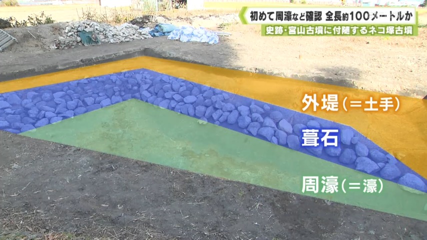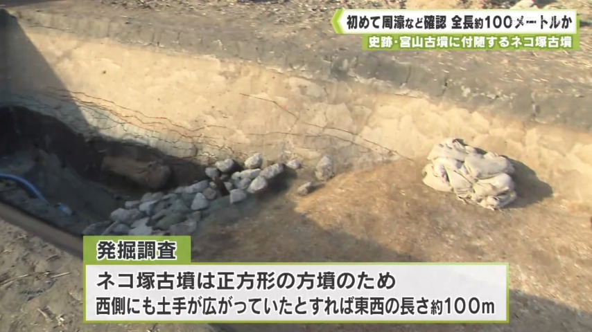 - ネコ塚古墳は正方形の方墳のため、西側にも土手が広がっていたとすれば、東西の長さはおよそ100メートルになるといい、想定されていた範囲よりも古墳の大きさが広がったということです。