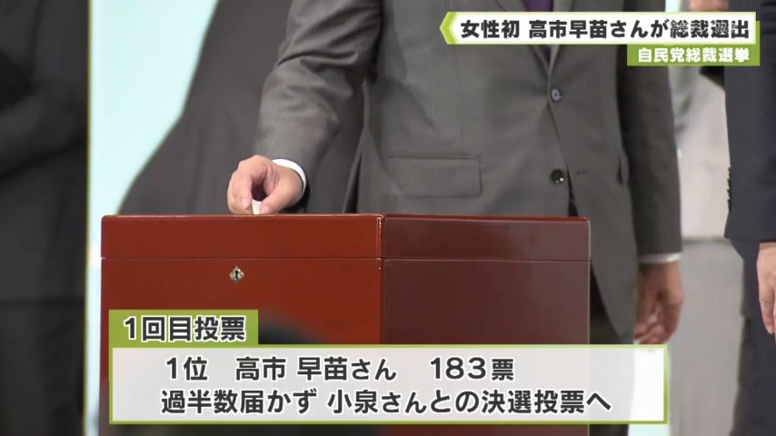 そして午後1時すぎ、党本部で国会議員による投票が始まりました。5人のうち高市早苗さんは、183票で1位となるも過半数に届かず、決着は2位の小泉進次郎さんとの決選投票に持ち越されました。