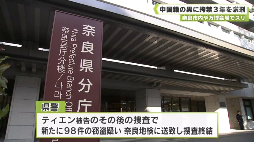 - 窃盗の罪に問われているのは中国籍の男、ティエン・ホンボー被告(41)です。起訴状などによりますとティエン被告は、2025年6月から7月にかけて、奈良市内の商店街や「大阪・関西万博」の会場などで日本人観光客から財布をすり取って現金を盗んだとされています。12月5日、奈良地裁で開かれた裁判で、検察側は「被害額はあわせて約23万円にのぼり、背後から財布を短時間ですり取るという巧妙で悪質な犯行」とし、拘禁3年を求刑しました。
