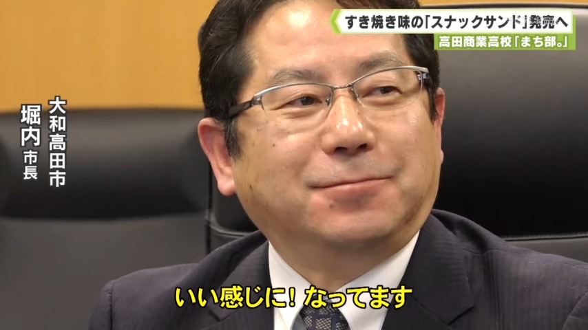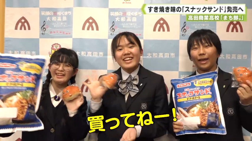 2月1日に大和高田市内をはじめ、近畿一円で発売されるフジパンの「スナックサンド高田商業高校のすき焼き味」。市立高田商業高校では、上級生が新入生にすき焼きをふるまい、歓迎する行事が60年以上前から行われており、その「すき焼き」を、市の魅力を発信する「まち部。」の生徒がレトルト商品として開発しました。これを皮切りに、歴代のメンバーがコンビニエンスストアと共同でおにぎりを商品化したほか、宅配ピザの会社とピザを生み出してきました。