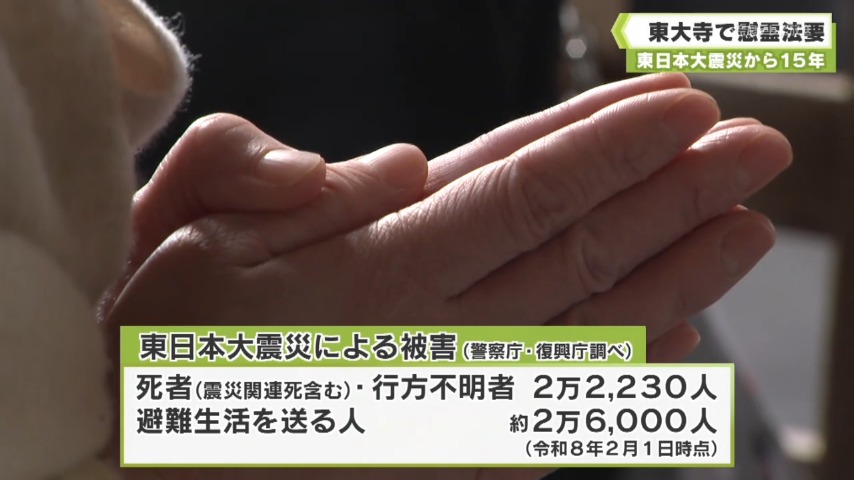 奈良市の東大寺では、ことしも慰霊の法要が営まれました。法要では、橋村 公英別当らが犠牲者を追悼するとともに被災地の復興を祈りました。