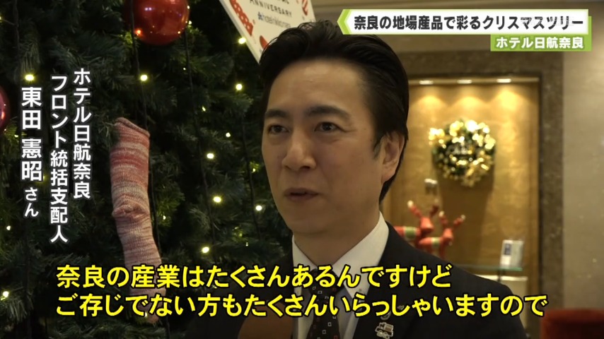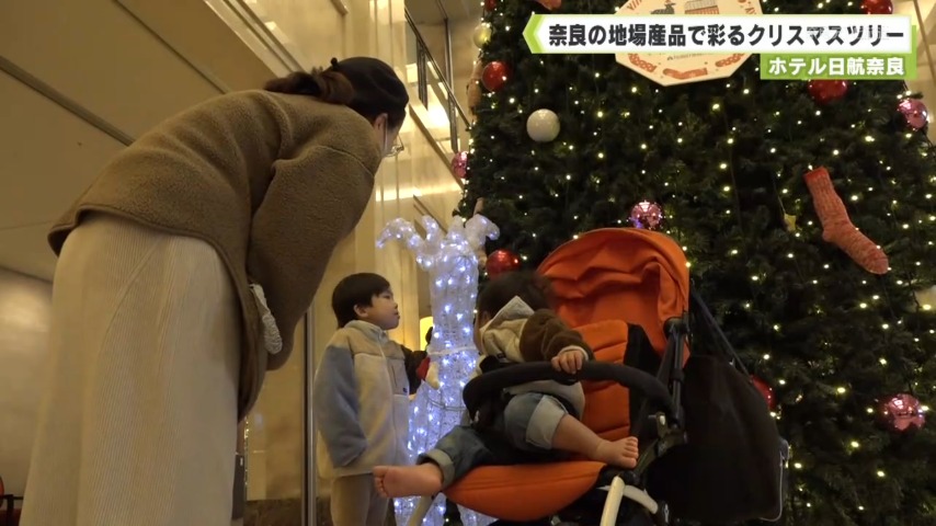 - 12月に入りクリスマスムードが高まる中、奈良市のホテル日航奈良では、奈良のある地場産品が飾られたツリーが登場しました。
