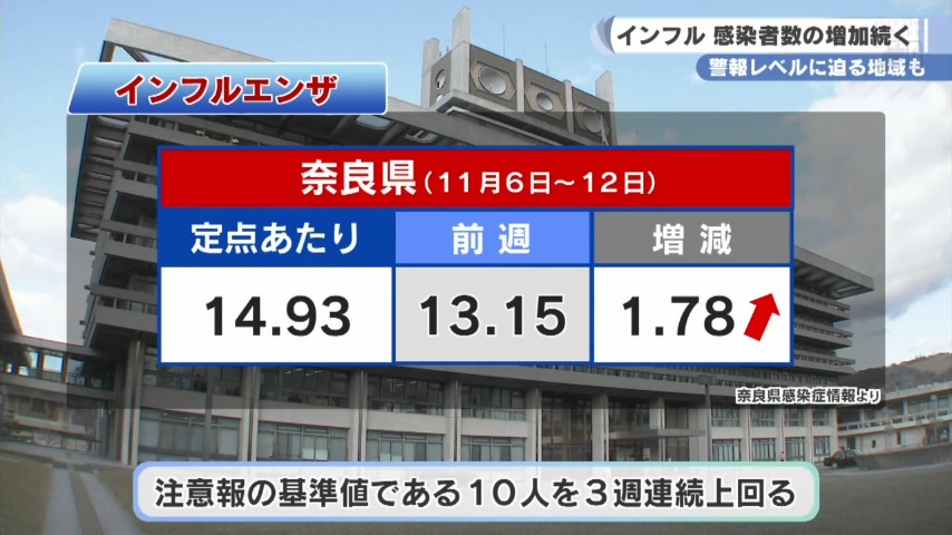 県によりますと11月12日までの1週間で県内の定点医療機関から報告されたインフルエンザの感染者の数は、定点あたりの平均で14.93人となり、前の週の約1.14倍に増加しました。