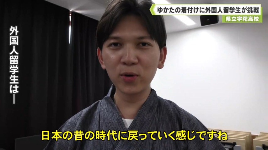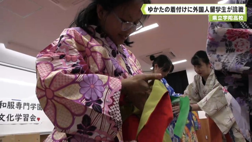 - 外国人留学生にゆかたの着付けなどを通して日本の文化を学んでもらおうという学習会が県立宇陀高校で開かれました。