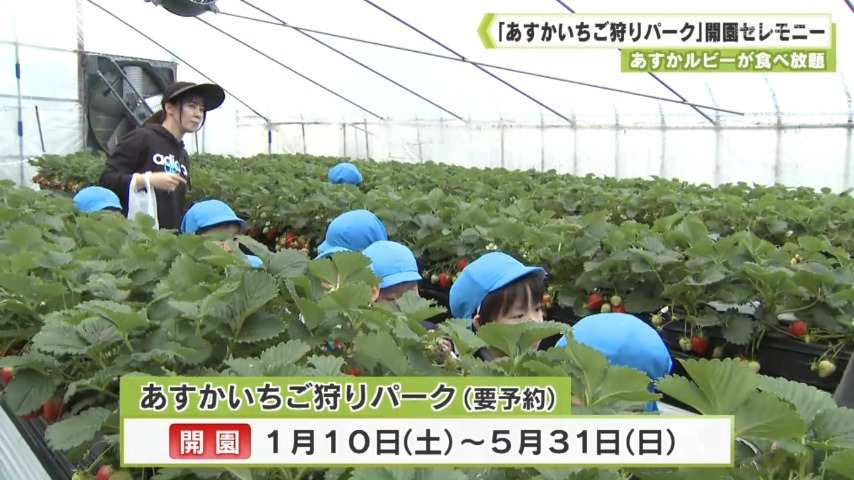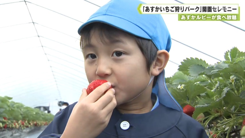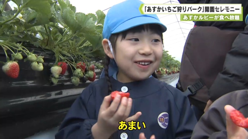 明日香村にある「あすかいちご狩りパーク」は、村内の17農園が協同で運営しています。予約した時期に応じて食べごろのハウスに案内され、30分間食べ放題であすかルビーを味わえます。10日からの開園を前に開かれたセレモニーには、イチゴ農家や、地元の園児などが出席し、開園を祝いました。