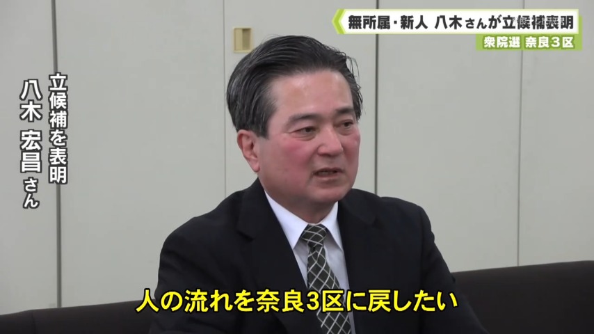 - 1月27日公示の衆議院選挙に向け、奈良3区に無所属で新人の八木宏昌さんが、立候補を表明しました。