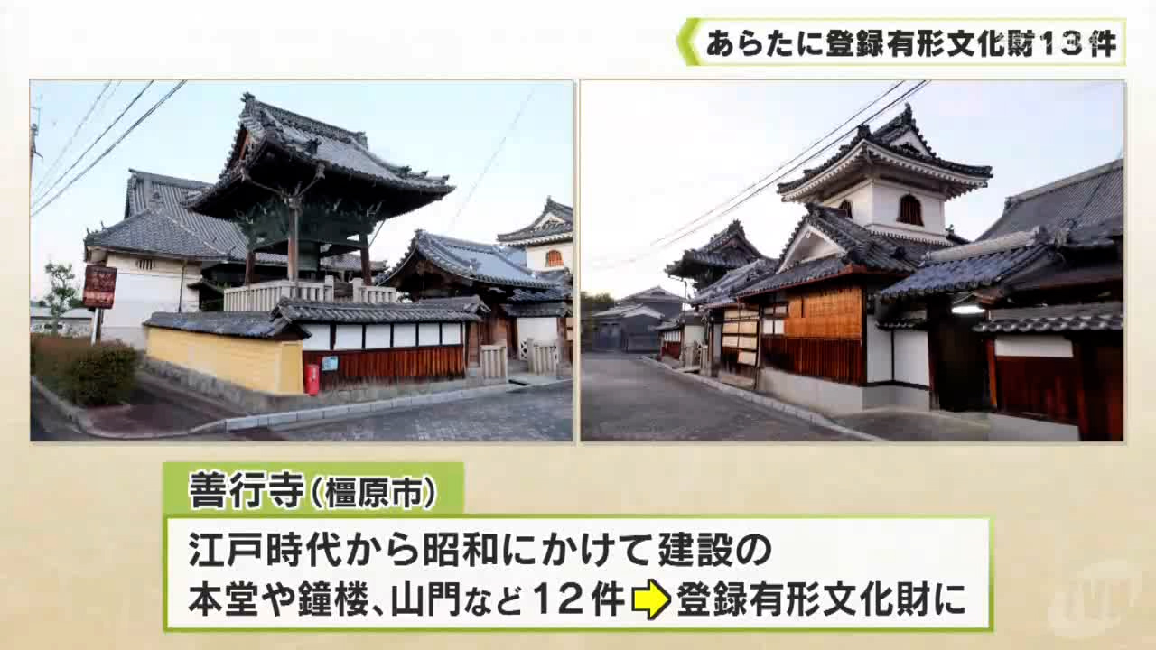 - 今回答申される建造物は、2カ所、あわせて13件です。このうち橿原市にある「善行寺」は、江戸時代末期の特徴がみられる荘厳で大規模な本堂や、彫刻がほどこされた鐘楼や山門をはじめ明治から昭和にかけての客殿や太鼓楼などあわせて12件が登録される予定です。