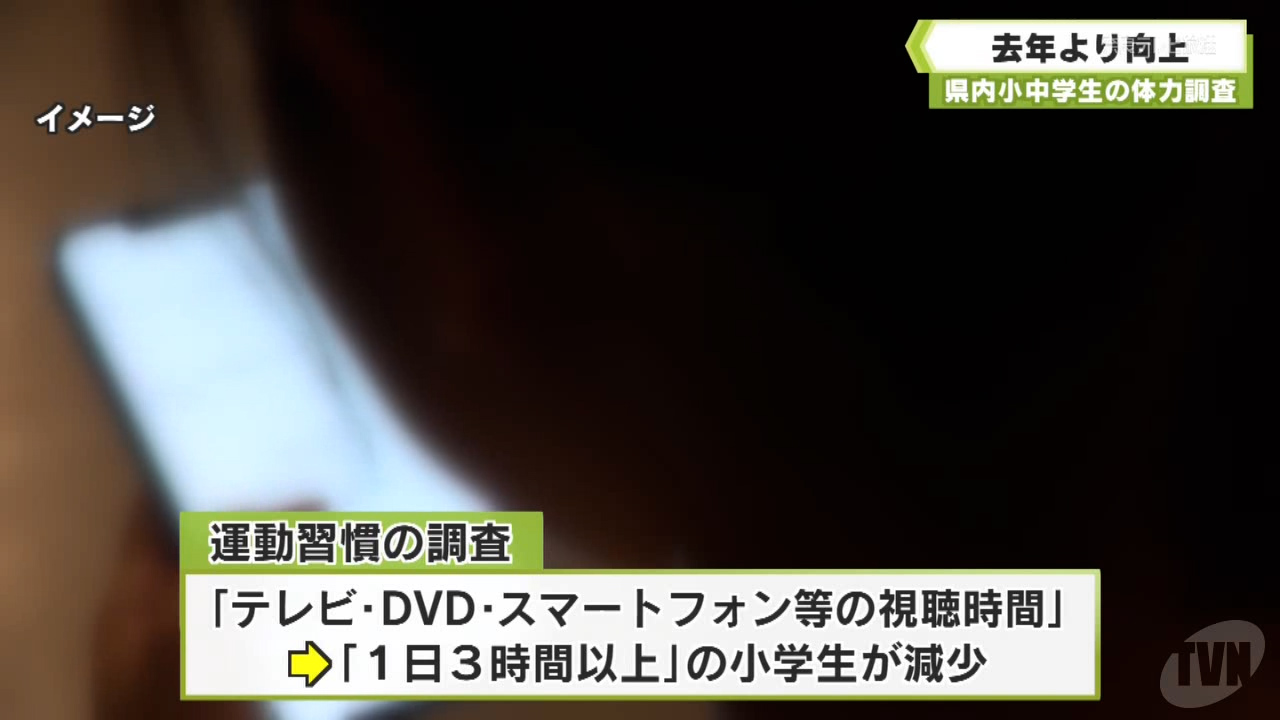 また、運動習慣の調査では小学生男子と中学生男女で「好き・やや好き」と答えた割合が増えたほかテレビやスマートフォン等を「1日3時間以上視聴する」と答えた小学生が減っているということです。