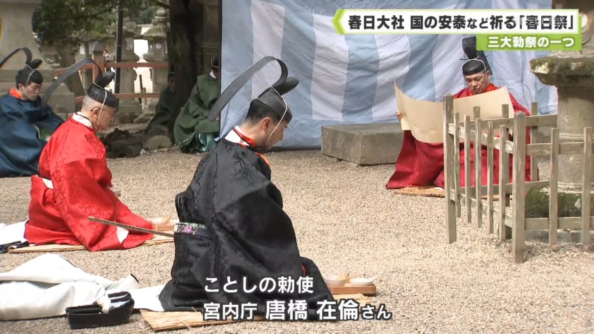 - 天皇の使いである勅使を迎え、国の安泰などを祈る例祭「春日祭」が13日、春日大社で行われました。