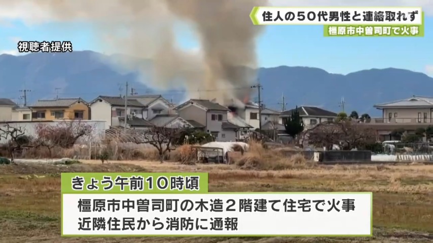 - 1月9日午前、橿原市の住宅で火事があり、この家に住む50代の男性と連絡が取れなくなっています。