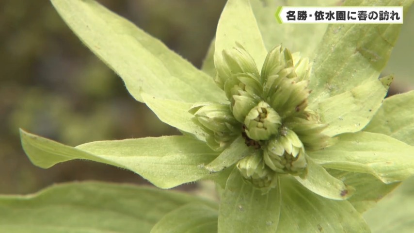 - 前園の通路脇には、フキノトウが顔を出していました。ふっくらと芽吹いた若々しい緑は、人々に春の訪れを告げます。このほか、後園では園内で最初に開花する桜、淡墨桜が小さな花を咲かせ始めていました。