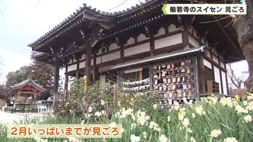1年を通してさまざまな花が楽しめる奈良市の般若寺では、スイセンの花が見ごろを迎えています。