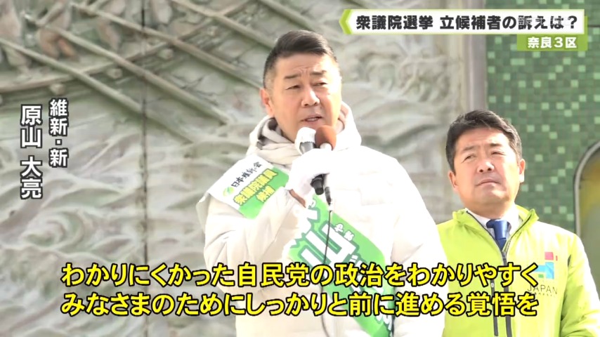 橿原市の市議会議員と県議会議員を務めた原山さんは維新の与党入りで国会運営がスピーディーになったと主張します。党が掲げる社会保障政策など12の公約を柱に、日本を前に進めていきたいと訴えます。