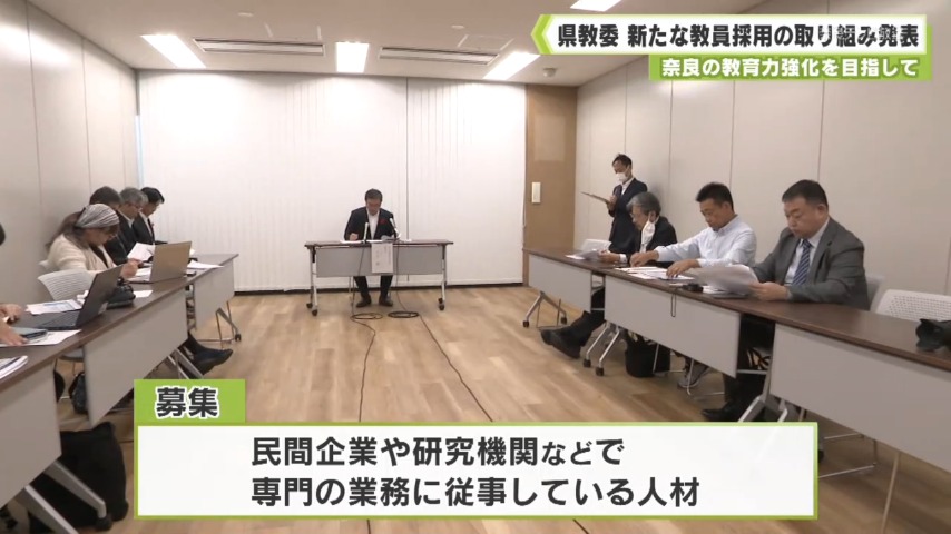 - 民間で培った知識や技術を教育現場に注入し、奈良の教育力強化を目指そうと、県教育委員会は、筆記試験のない新たな社会人教員の採用を決め、30日から募集を始めました。