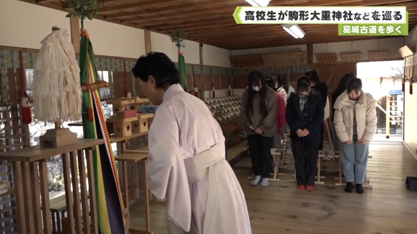 - 毎年、二十四節気のひとつ大寒の時期に行われるこの行事は、奈良の古道に古くからある神社などを巡りながら生徒同士の親睦を深めるものです。今回は、1年生と2年生約2000人が葛城古道を歩きました。はじめに訪れた御所市の駒形大重神社では、村山陽子宮司からお祓いをうけたあと、参拝しました。