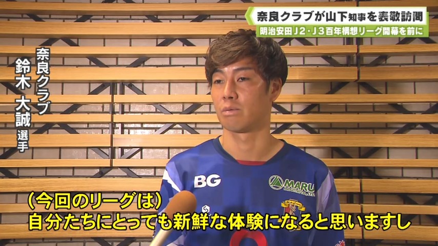 - 山下知事を表敬訪問したのは、奈良クラブの濵田満代表取締役社長と鈴木大誠選手です。初めに濵田社長が、Jリーグが、今シーズンから欧州リーグなどに合わせ秋から春にかけて行われることを説明しました。それまでの期間に行われる明治安田J2・J3百年構想リーグでは、J2・J3合わせ40チームが4つの地域に分かれて戦いその後、プレーオフで順位を決定します。