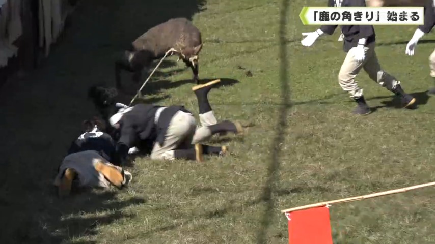 「鹿の角きり」は、江戸時代から続く行事です。発情期を迎えたオスのシカは、気が荒くなるため、人やほかのシカに危害を与えないように、毎年この時期に角を切り落とします。