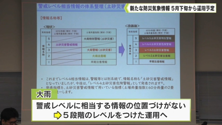 「避難情報」では5段階の「警戒レベル」で避難時に取るべき行動を示していて、新たな運用は気象台などが発令する防災気象情報と警戒レベルの関係を分かりやすくすることが狙いです。