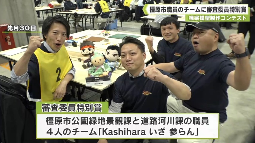 - 受賞したのは、橿原市公園緑地景観課と道路河川課の4人で結成されたチームです。模型づくりで橋の構造の仕組みなどを理解し、技術力を向上させようと今回、コンテストに初挑戦しました。