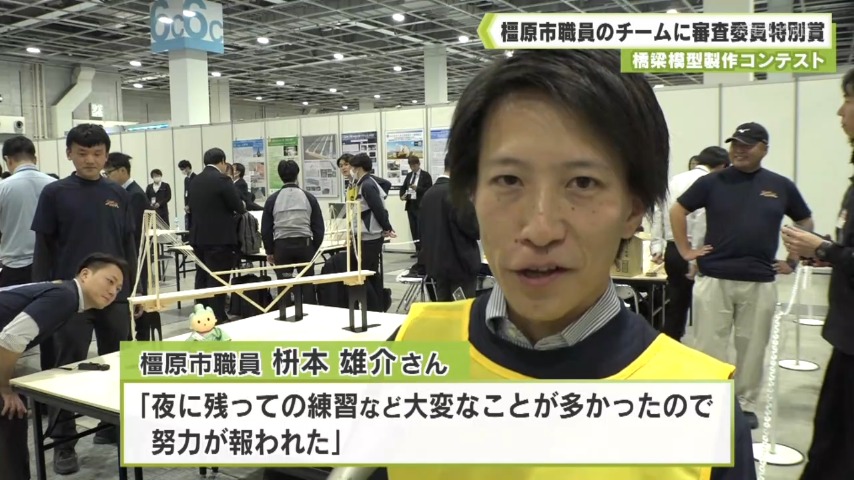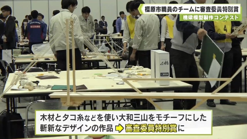 - 10月末に行われた、橋梁模型製作コンテストに初めて参加した橿原市の土木技術職員が、審査委員特別賞を受賞しました。