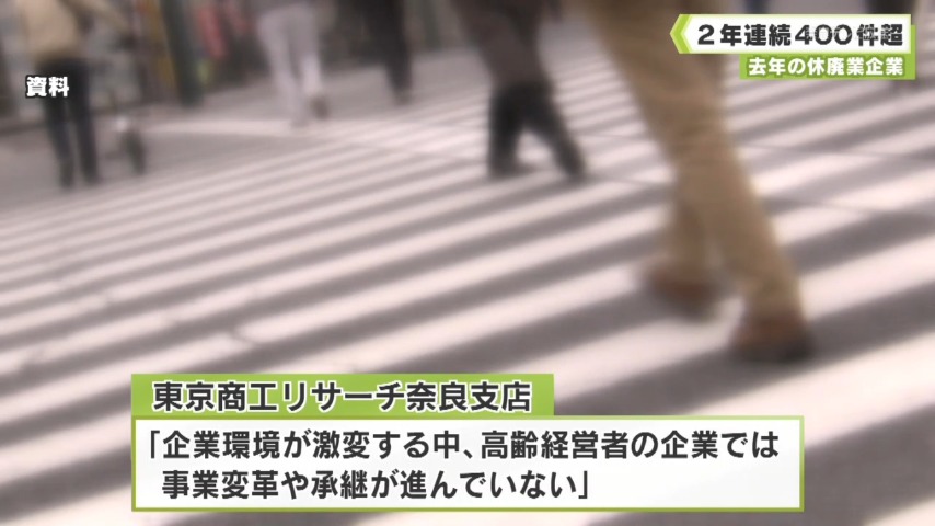 民間の信用調査会社=東京商工リサーチ奈良支店によりますと、2025年1年間に休廃業や解散など、倒産以外で事業を停止した県内の企業は418件で、2024年に続いて400件を超えました。