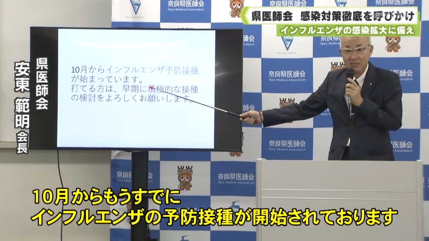 - また、奈良県でも流行期に入ったインフルエンザについては「体感的には1カ月以上早い」とし、A型のウイルスに感染した人が多いようだと説明しました。そのうえで、感染対策の徹底を呼び掛けました。