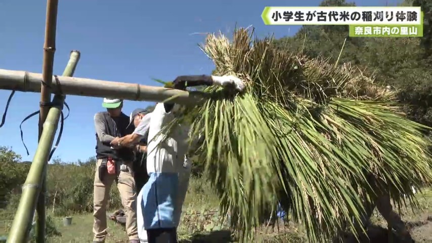 奈良市内の里山 小学生が古代米の稲刈り体験