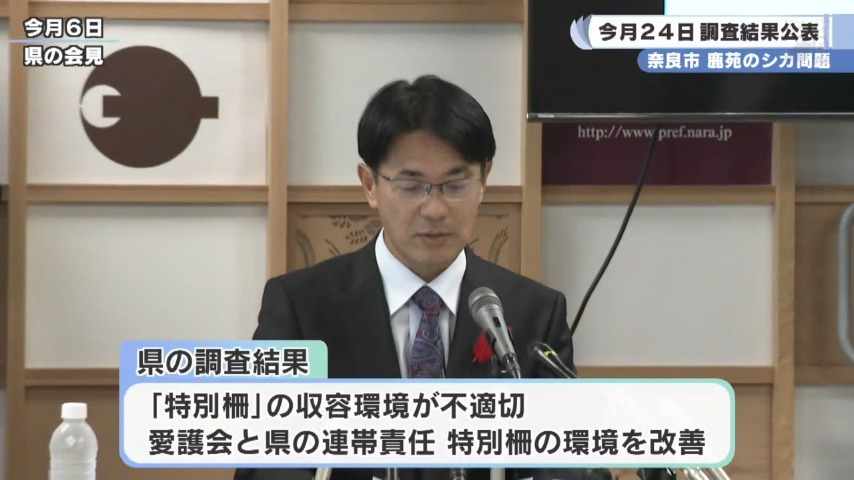 「鹿苑」には、農作物や人に危害を与えたシカを収容する「特別柵」と呼ばれる場所があり、奈良の鹿愛護会の獣医師が「特別柵」のオスのシカに限り、死亡時の平均体重が軽いことなどから「エサの量や質が不十分で動物虐待にあたる」と、県や市に通報書を提出していました。「鹿苑」を設置した県は6日、調査結果を公表し「特別柵」の収容環境は不適切とした上で、愛護会と県の連帯責任とし特別柵の環境を改善するとしました。