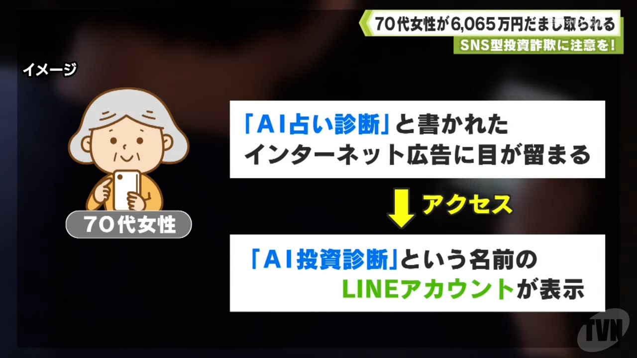 - 県警によりますと女性は2025年8月、スマートフォンで「AI占い診断」と書かれたインターネット広告に目が留まり、アクセスすると、「AI投資診断」という名前のLINEアカウントが表示されたといいます。