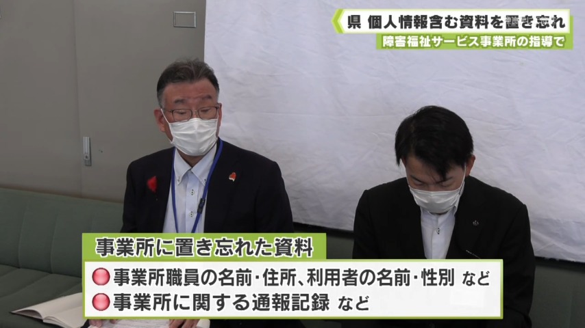 - 県は障害福祉サービス事業所に運営指導を行った際、個人情報を含む書類を事業所に置き忘れていたと発表しました。