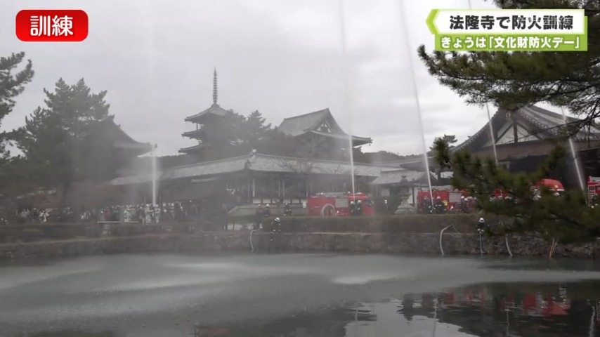 - 26日は「文化財防火デー」です。斑鳩町にある世界遺産・法隆寺では、僧侶や消防団員らが防火訓練に臨みました。