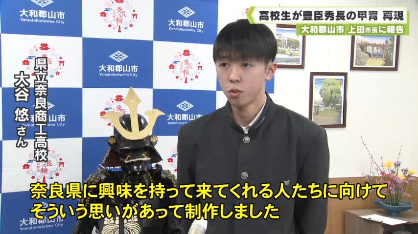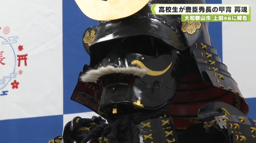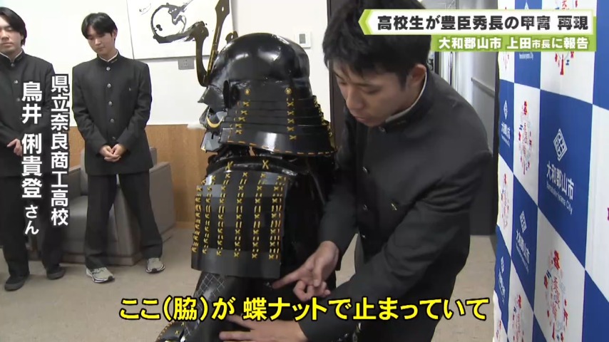 県立奈良商工高校・機械工学科の生徒9人が大和郡山市の上田市長に披露したのは約1年かけて再現した豊臣秀長の甲冑です。重さは約15kg。大分県に現存する秀長の甲冑を参考にするなど当時の構造や様式を可能な限り再現することを目指してきました。その一方で、現代人の体格に合わせたり、動きやすいように腰の帯で固定して肩に隙間ができるよう工夫したりしたということです。