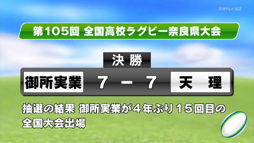 全国高校ラグビー奈良県大会・決勝は、御所実業と天理が引き分け両校優勝となりました。