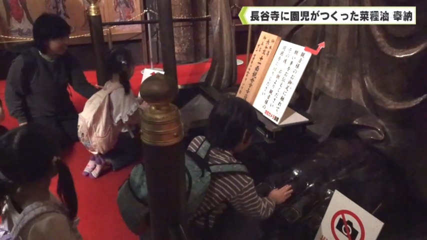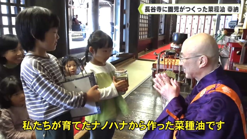 - 桜井市にある長谷寺に園児がつくった菜種油が、奉納されました。