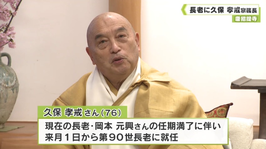 - 久保さんは76歳。現在の長老・岡本元興さんの任期満了に伴い、4月1日から第90世長老に就任します。久保さんは唐招提寺の執事長などを経て、現在は、律宗の宗務長を務めています。