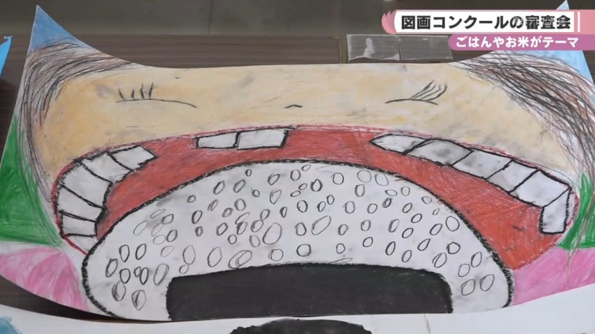 審査会場には大きな口でおにぎりをほおばる様子を大胆な構図で表現したり、農作業や稲そのものを描いたり、子どもたちの感性が光る作品が並びます。また、構図の似た2つの作品は双子が描いたものだといいます。なお審査会で選ばれた9点は奈良県の代表作品として全国審査会に推薦するということです。