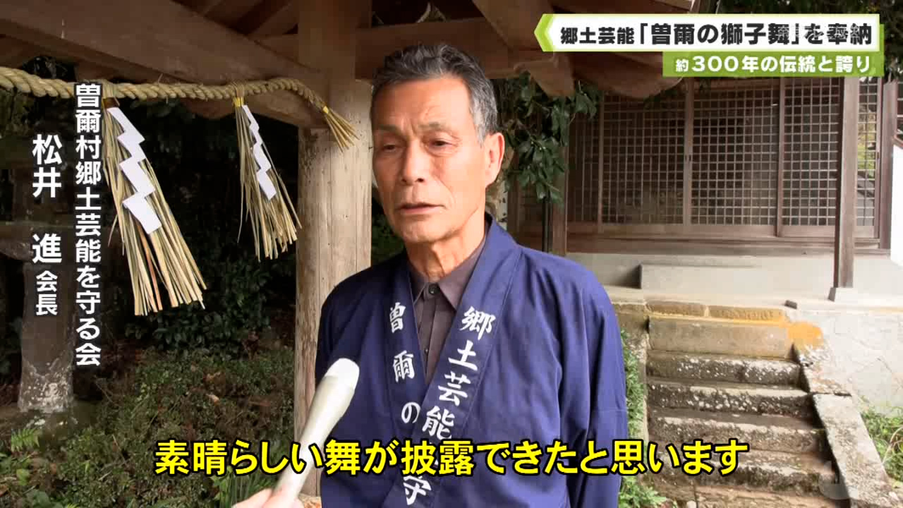 「素晴らしい舞が披露できたと思います。江戸時代からずっと続いていることに昔の先輩も素晴らしいですし、これから若者たちが引き継いでくれると思いますので、曽爾村の自信を持てる祭りとしてやっていきたいと思います」