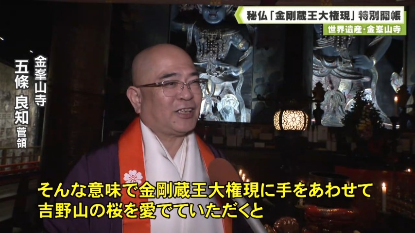 「吉野山の桜は金剛蔵王大権現にお供えをされた祈りの桜ですから、そんな意味で金剛蔵王大権現に手をあわせて吉野山の桜を愛でていただくと、また心が洗われるというものですから、皆さんのお越しをお待ちしております」
