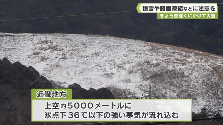 気象台によりますと、近畿地方では上空約5000メートルに氷点下36℃以下の強い寒気が流れ込んでいます。8日午後3時までに奈良市針で4センチ、五條市で10センチの積雪があったということです。