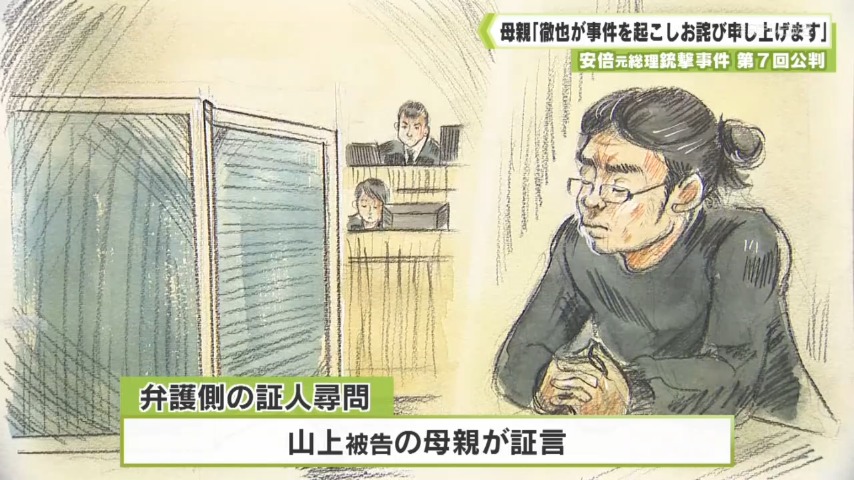 - 安倍元総理銃撃事件で殺人などの罪に問われている山上徹也被告の第7回公判が開かれました。13日は、弁護側の証拠調べと証人尋問が始まり、旧統一教会に入信した母親は事件について「徹也が事件を起こしたことを心よりお詫び申し上げます」と謝罪しました。