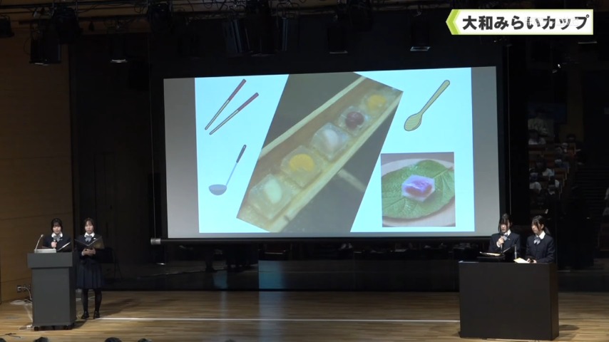 - 今回は、県内4つの学校のあわせて14チームが、企業と連携して練り上げたプランを発表。流しそうめんのようにくず餅を流すイベントを開き、葛の魅力を広めようというものや、石でできた遺物が残る明日香村に、石をテーマにしたカフェを開き、地域の活性化を図るプランなど、ユニークなアイデアが披露されました。