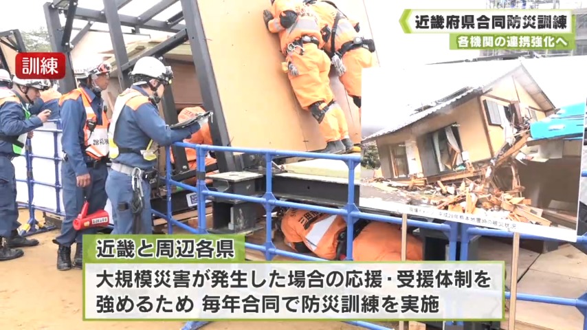 - 近畿2府4県と福井・三重・徳島の各県は、大規模な災害が発生した場合の広域的な応援や受け入れ体制を強めるため、毎年、合同で防災訓練を行っています。
