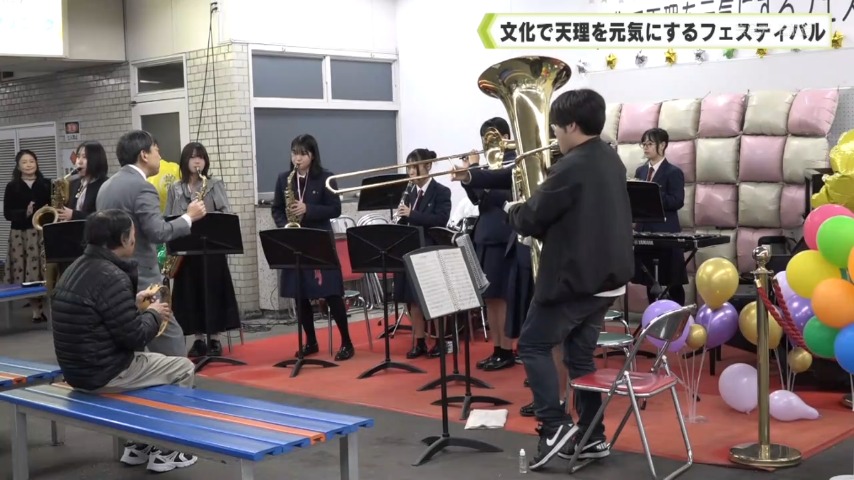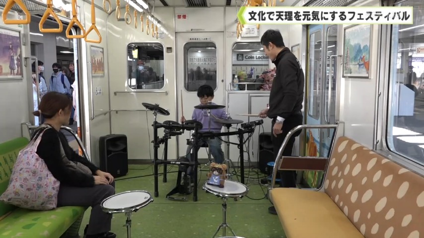 - 天理が芸術であふれるまちにと願いを込めた催し。ホームには近鉄のラッピング列車「ならしかトレイン」が停まり、中ではドラムやクラリネットなどの楽器演奏の体験が行われました。