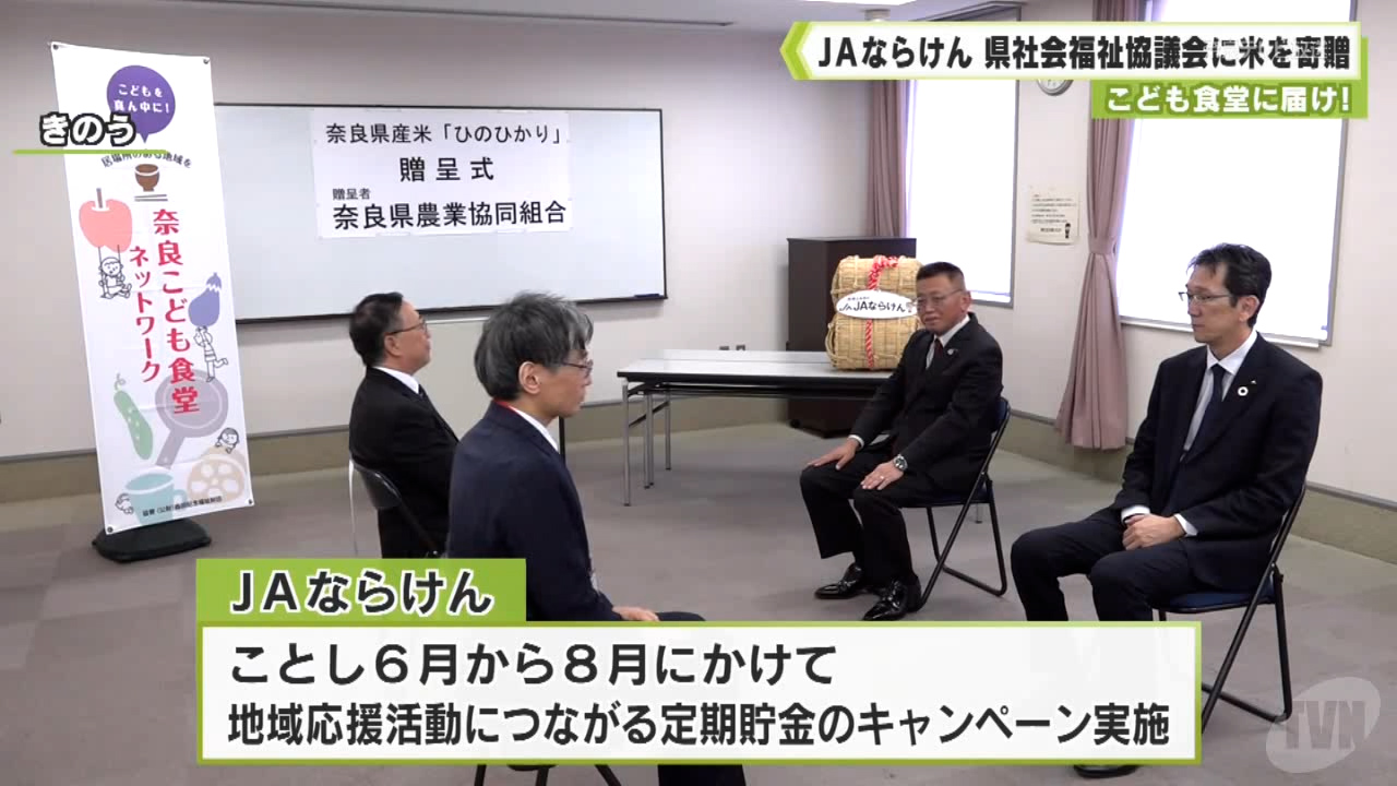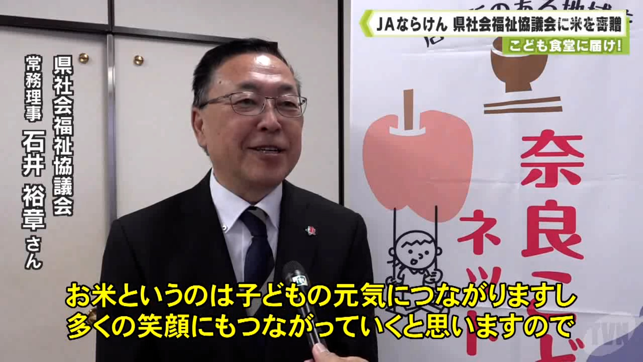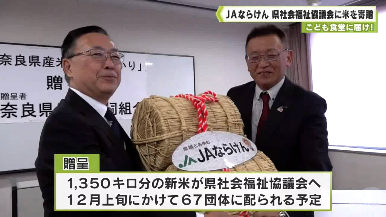 今回は、1350キロ分の新米が県社会福祉協議会に贈られました。米は5キロずつ袋に小分けされ、12月上旬をめどに奈良こども食堂ネットワークに加盟する67団体に配られる予定です。